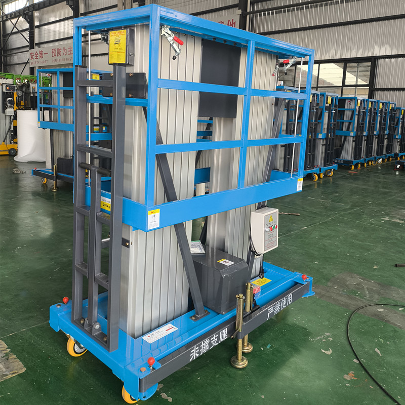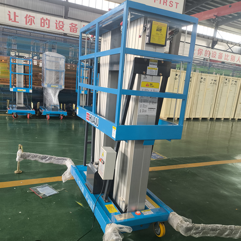 铝合金升降平台采用高强度优质铝合金材料,锰钢钢板加厚底盘和四个支撑腿支撑,安全可靠。设备标配下控和遥控方式升降,方便高空作业人员操作设备。设备体积小重量轻,使用轻便省时高效,非常适合进出狭小空间或电梯轿厢。